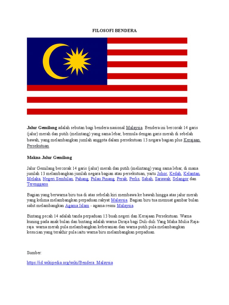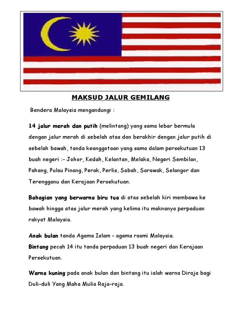 Kuning adalah warna kerajaan malaysia. Agama islam sebagai agama rasmi negara. Nyatakan maksud anak bulan dan bintang dalam bendera malaysia. Seluruh warna pada bendera melambangkan warisan kebudayaan. Bendera yang dipasang dalam acara perayaan hari kemederkaan malaysia di kansas, amerika serikat, dilaporkan ke polisi sebagai bendera as yang dinodai dengan simbol kelompok yang menyebut diri negara islam (isis).